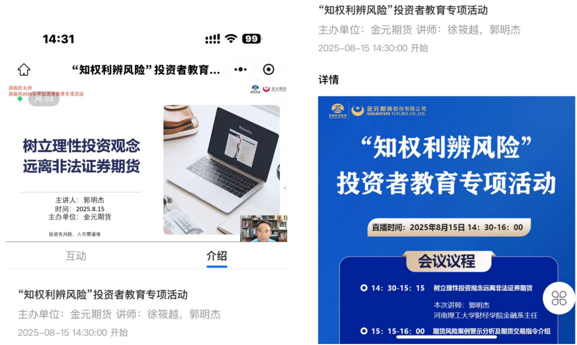 在全球经济面临下行压力、中国经济持续复苏的背景下,投资者教育作为风险管理的重要环节,正日益受到重视。2025年8月15日,郑州商品交易所(以下简称“郑商所”)组织举办了以“知权利辨风险”为主题的投资者教育专题讲座。本次活动特邀河南理工大学财经学院金融系主任郭明杰做主讲,就“树立理性投资观念,远离非法证券期货”进行系统讲解,呼应了当前鼓励长期投资、培育耐心资本的政策导向。