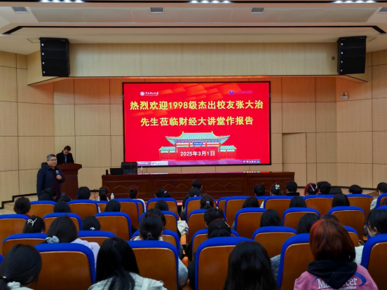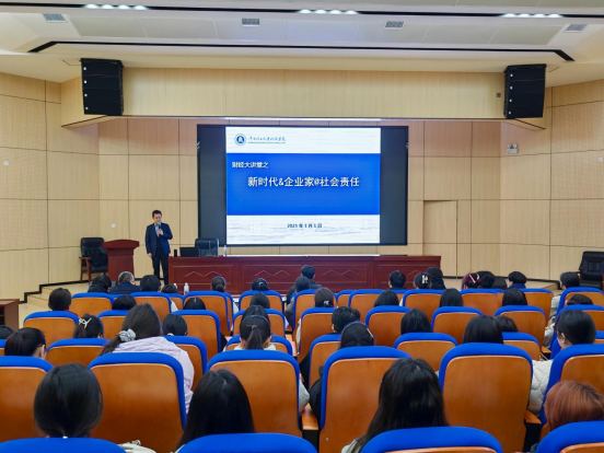 3月1日上午,河南理工大学会计学专业1998级优秀校友、风神轮胎股份有限公司工会主席张大治先生在经管楼尚为学术报告厅举行了主题为“新时代&企业家@社会责任”的专题报告会。本次活动旨在落实学院“企业家、实务专家进校园”全方位育人方针,深化产教融合,拓展校友育人平台,创新会计学专业培养方案中“专创融合”课程授课模式,切实提升我院本科生、研究生的人才培养和社会需求适配度。报告会由学院王玉法教授主持,2022级会计本科生、2024级会计与金融专硕研究生等400余人参加。