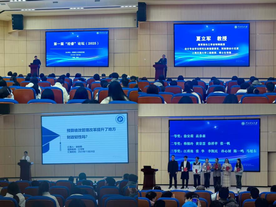 2025年11月20日,河南理工大学财经学院第一届“经睿”论坛在尚为学术报告厅举行。本次论坛以“汇聚精英智慧、探讨学科前沿、助力学术创新与人才培养”为核心宗旨,聚焦智能会计、数字经济、乡村振兴、新质生产力等关键领域,搭建了跨学界、跨实践的高端学术交流平台。教育部长江学者特聘教授、上海交通大学安泰经济与管理学院二级教授、博士生导师夏立军教授,河南理工大学工商管理学院院长傅端香教授、应急管理学院执行院长张小兵教授、研究生院副院长郭海儒教授、社科处单文娟科长、财经学院领导班子成员以及学院师生代表150余人参加论坛。论坛开幕式由财经学院副院长江书军主持。