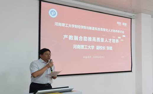 副校长张锟做了“产教融合助推高质量人才培养”主题发言。他代表学校对财经学院建设产业学院表示极大的支持,期望产业学院紧跟时代发展步伐进行新探索和新示范,并为此提出三方面建议和要求,第一,校企要做好五个对接:一是校企对接,引企入校,建设企业真实场景实验室;二是专业对接,大专业与小专业建设相结合;三是课程对接,核心课程与课程模块要结合;四是模式对接,实现自建和共建相结合;五是教研与科研对接,推动区域经济发展。第二,产业学院要持续提升,及时总结经验,及时整理发展过程中遇到的问题并提出解决方案,不断提高管理水平和育人质量。第三,产业学院要对标建设,按照教育部门的要求和条件进行高质量建设,争取成为全国性示范产业学院。