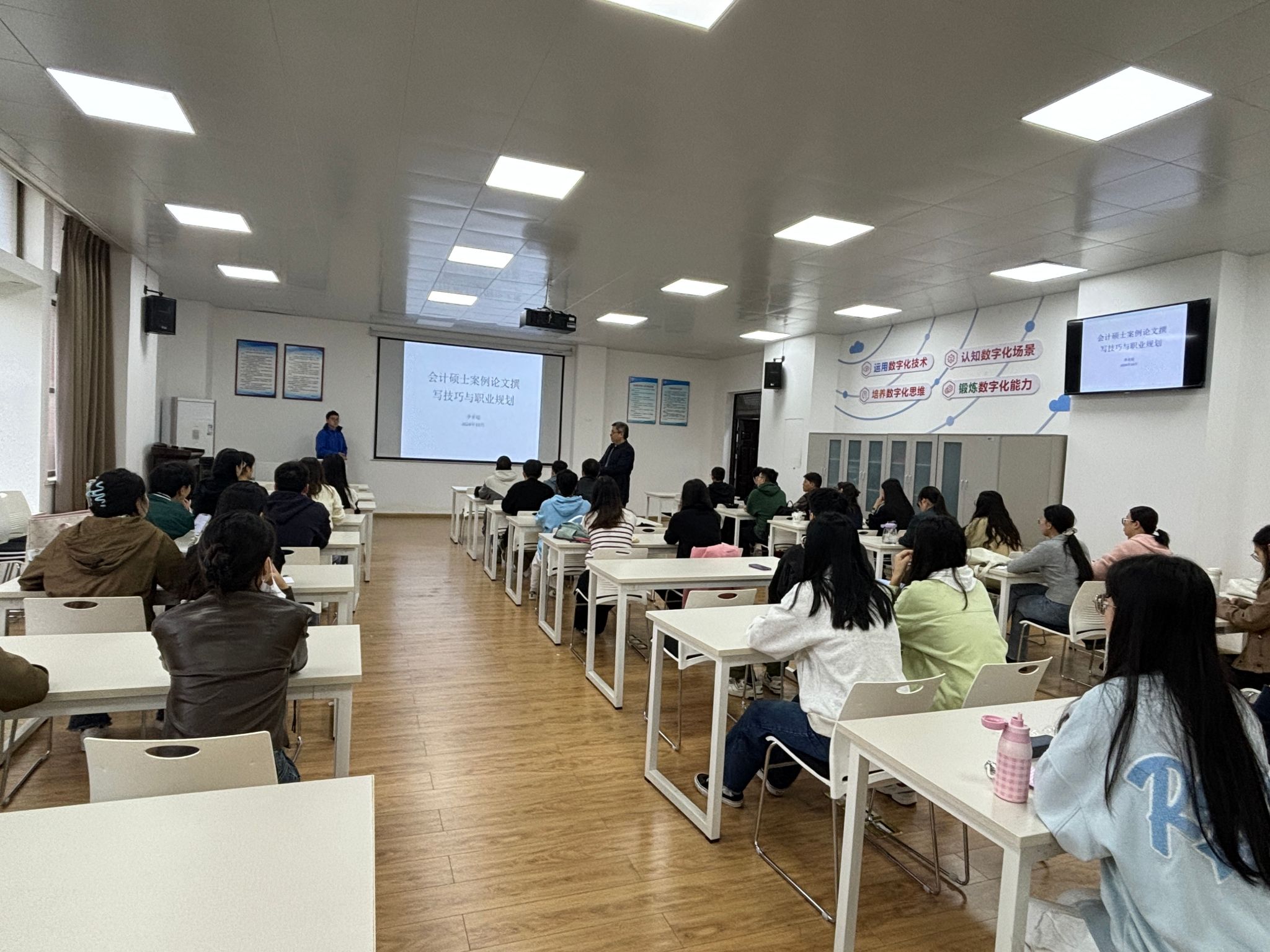 在这次讲座活动中,李亚超博士首先详细介绍了案例类论文的写作技巧,重点分析了会计专硕论文撰写的注意事项以及案例类论文的“八股”写作框架,同时建议同学们在论文选题时可以借助问询函拓宽发现问题的渠道。紧接着,李亚超博士分享了自己的学术经历和职业发展心得,在职业规划方面为同学们提供了宝贵的建议,他鼓励大家脚踏实地,通过实习、考证等方式提升自身的专业技能和综合素质。此外,李亚超博士还与学生进行了互动交流,耐心解答了学生们在案例论文撰写和职业规划方面遇到的问题。
