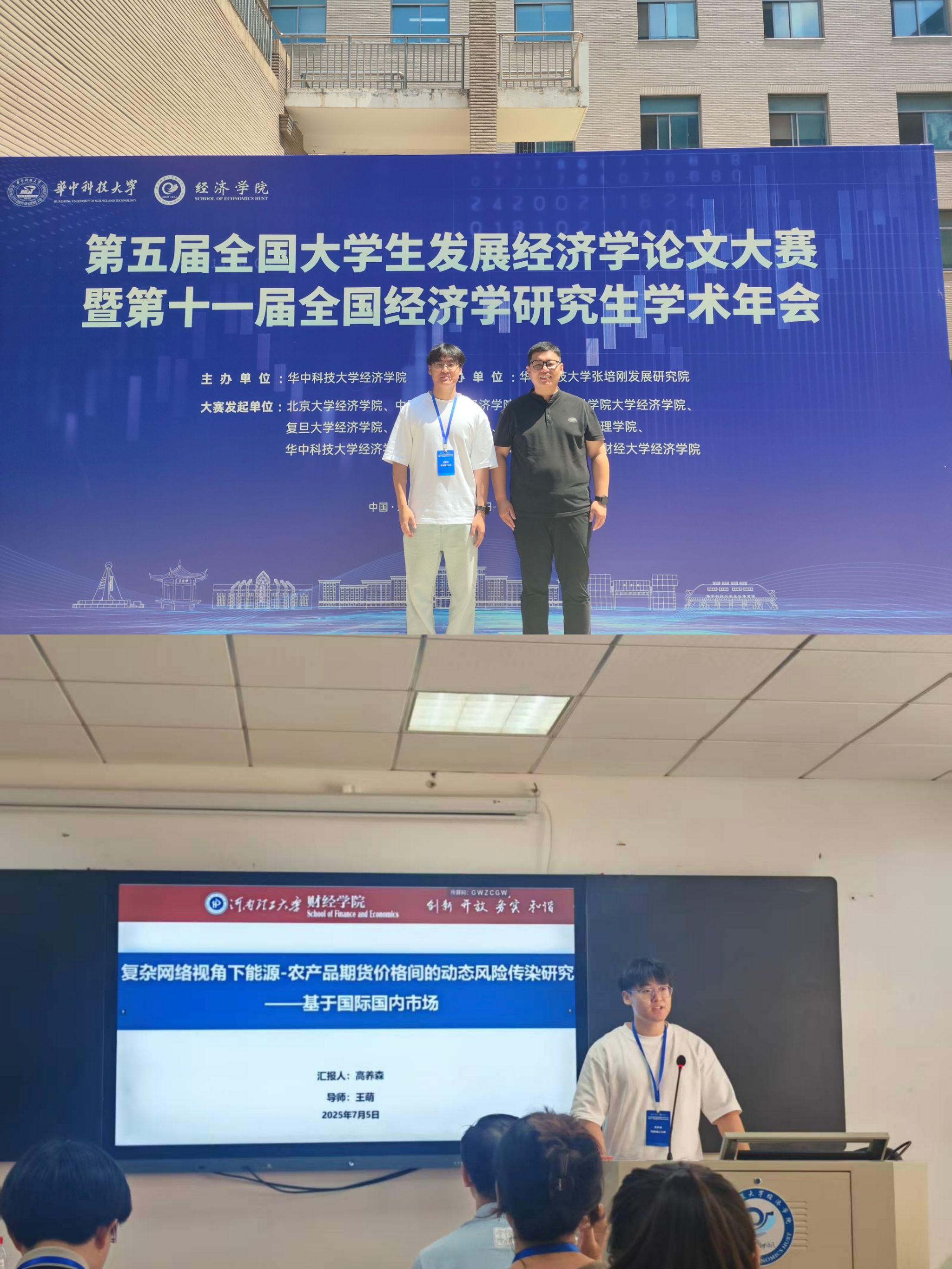 7月4日至6日,第五届全国大学生发展经济学论文大赛在武汉成功举办,本届论文大赛由华中科技大学经济学院主办。大赛旨在以习近平新时代中国特色社会主义思想为指导,紧密结合中国经济发展实践,运用现代经济学研究方法,围绕发展经济学各领域重大理论与现实问题展开创新性研究,力争做到“讲好中国故事、传播好中国声音、增强在国际上的话语权”。我院金融专硕高养森(指导教师王萌)提交的论文《复杂网络视角下能源-农产品期货价格间的动态风险传染研究——基于国际国内市场》入选大赛终评环节,受邀参加线下汇报,最终荣获硕士组三等奖,实现了我校在该项赛事获奖的首次突破。