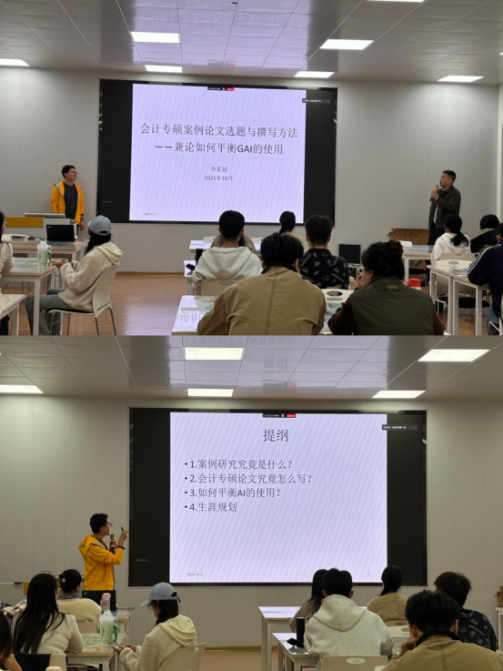 讲座伊始,李亚超博士以“案例研究是什么”为切入点,结合会计领域典型案例,系统阐述了案例研究的基本理念与方法,帮助同学们构建起清晰的学术认知框架。随后,围绕“会计专硕论文究竟怎么写”这一核心议题,李亚超博士从选题技巧、框架搭建、数据收集与分析等多个环节展开深入讲解,并结合实际案例剖析了论文写作中的常见误区与改进方法,为同学们提供了具有实操性的论文写作指导。在AI技术广泛应用的背景下,李亚超博士就“如何在写论文中平衡AI的使用”进行重点探讨。他强调,AI可作为文献检索与数据整理的辅助工具,但必须严格遵循学术规范,厘清使用边界,防范学术不端风险,引导同学们合理利用AI 技术提升写作效率的同时坚守学术诚信底线。讲座最后,李亚超博士结合行业发展趋势与个人经验,为同学们的学业规划与职业发展提供了宝贵建议,他鼓励大家夯实专业基础,通过实习、考证等方式提升自身的专业技能和综合素质。