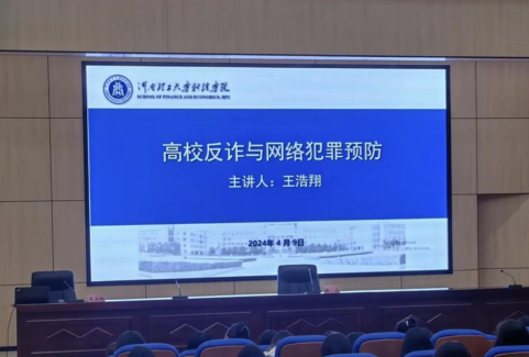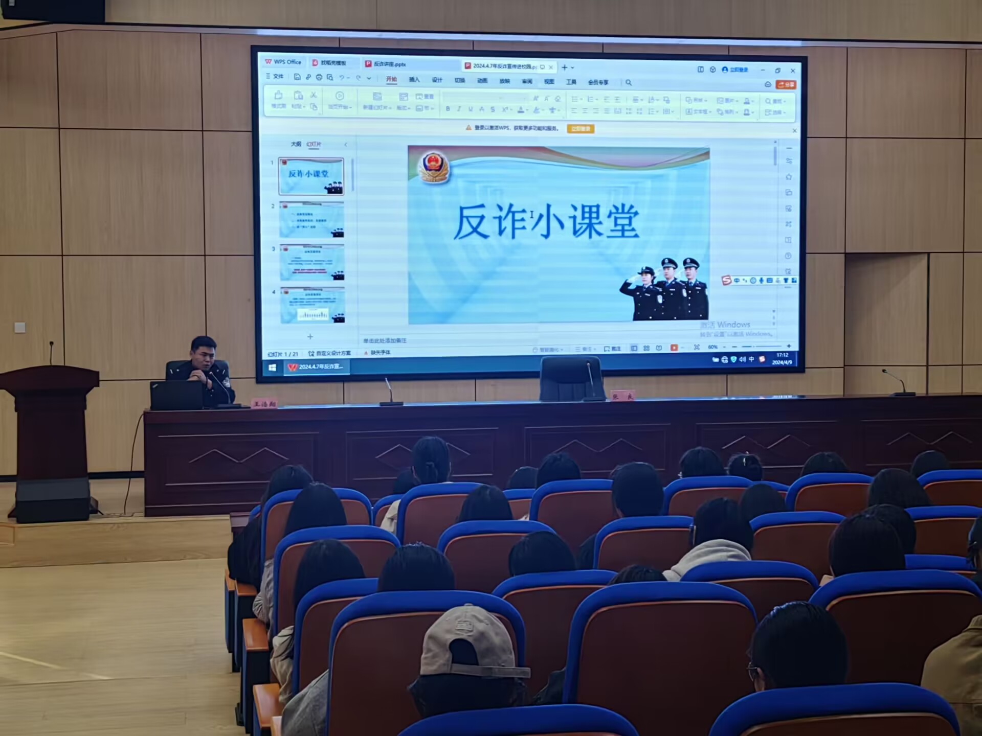 4月9日下午,财经学院在经管楼尚为报告厅召开反诈骗知识宣传讲座。全体宿舍长参加了此次讲座。讲座由城乡一体化示范区分局派出所王浩翔警官主讲。