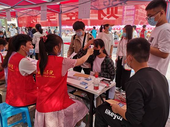 早上6:00,迎新现场各项工作已布置妥当,学院各相关部门的迎新人员也准备就绪。在指导老师和学生志愿者的引导下,20级学生陆续地前来报到,填写个人信息,办理入学手续和宿舍入住手续。学生志愿者们统一身穿红色马甲,佩戴工作牌证,帮助新生看管行李,指引道路,表现了学长学姐们对20级新生的欢迎与热爱。我院教工党员志愿者们组成服务车队,亲自在校门口接待新生,帮助他们搬运行李并送回宿舍,深刻体现了我院老师对20级学子的关怀与照顾。此次活动过程中,我院积极响应国家防疫号召,高度重视学生身体健康问题,要求学生统一上交个人健康登记表,并对入校学生进行体温测量,严格禁止不相关人士、带有不良症状学生入校,保证在校学生人身安全。其次,我院老师非常关心20级学子的家庭情况,关注贫困学子,亲自在迎新处询问新生家庭情况并通知“绿色通道”等相关事宜,为贫困生提供了一定的生活保障。为进一步获取新生动态,了解学生个人情况,我院老师多次亲临现场,给予新生鼓励与关怀。