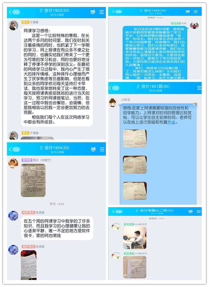 这次网络班会活动旨在让同学们切磋、分享线上学习经验和感悟,以助于我们在疫情期间更好地进行专业学习和自我提升,进一步深入推进各班级优良班风学风建设打下基础。班会开始前,辅导员在QQ班级群里提前发布班会时间和具体要求,提前准备发言材料。班会正式开始后,同学们纷纷通过文字和图片来分享自己疫情期间的学习状态、学习经验和感悟,透过同学们上传的认真学习时图片、网课笔记图片以及线上学习感悟和经验,真切地感受到了同学们在网络学习过程中从抵触到接纳的情绪变化,甚至把网络学习方式看做是锻炼自制力、有效提升学习效率的最佳机会。同学们畅所欲言,线上互动交流,气氛融洽。在学习委员的精心主持下,各班均达到了线上主题班会的预期目的。各班学习委员还整理班会的文字和图片在班级群里与大家分享。