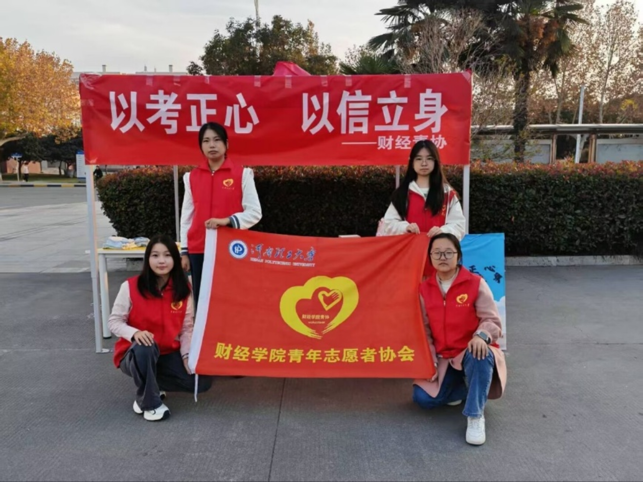 为引导学生树立诚信考试理念,强化规则意识,营造公平公正的校园考试氛围,河南理工大学财经学院青年志愿者协会于11月15日至16日,在学苑餐厅东门门口开展“以考正心,以信立身”主题志愿活动,通过趣味互动传递诚信理念。