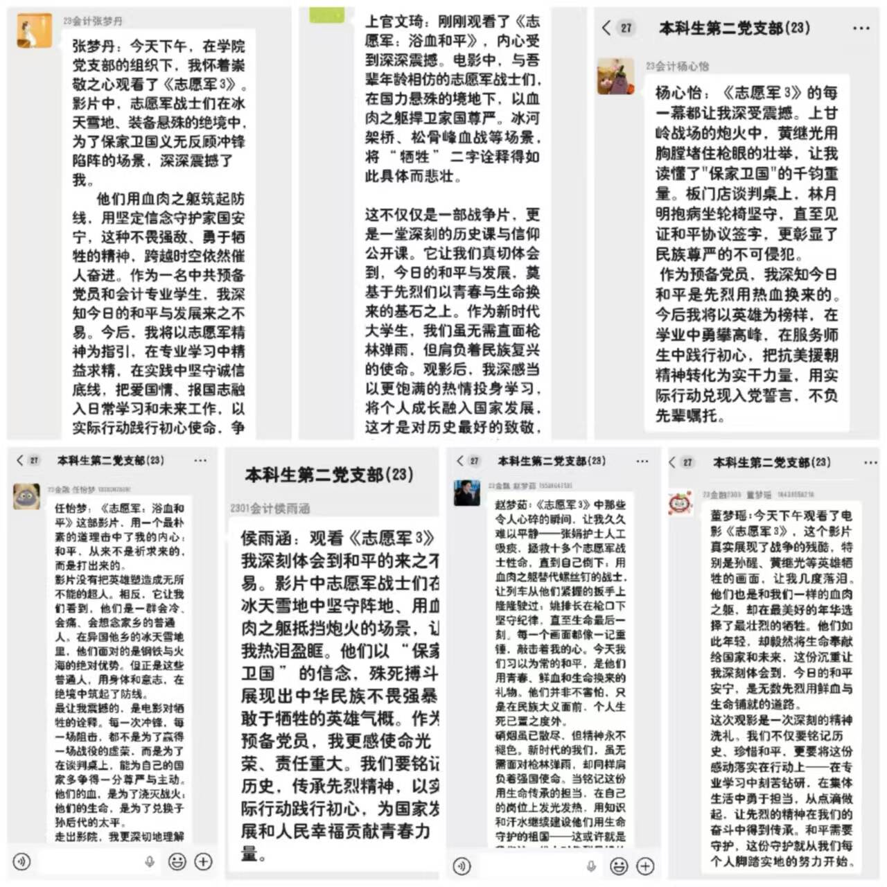 观影结束后,党支部微信群内瞬间热闹起来,党员们纷纷以文字的形式分享观影感受,线上讨论热烈非凡。上官文琦写道:“这不仅仅是一部战争片,更是一堂深刻的历史课和信仰公开课!”张梦丹感慨:“今后,我将以志愿军精神为指引,在专业学习中精益求精,在实践中坚守诚信底线,把爱国情、报国志融入日常学习和未来工作,以实际行动践行初心使命,争做有理想、敢担当、能吃苦、肯奋斗的新时代青年!”程怡苗分享:“影片让我们看到,志愿军战士不是冰冷的战争符号,他们是父亲、是儿子、是恋人,他们的勇敢不是源于对死亡的无畏,而是源于对家国的眷恋、对和平的渴望!”