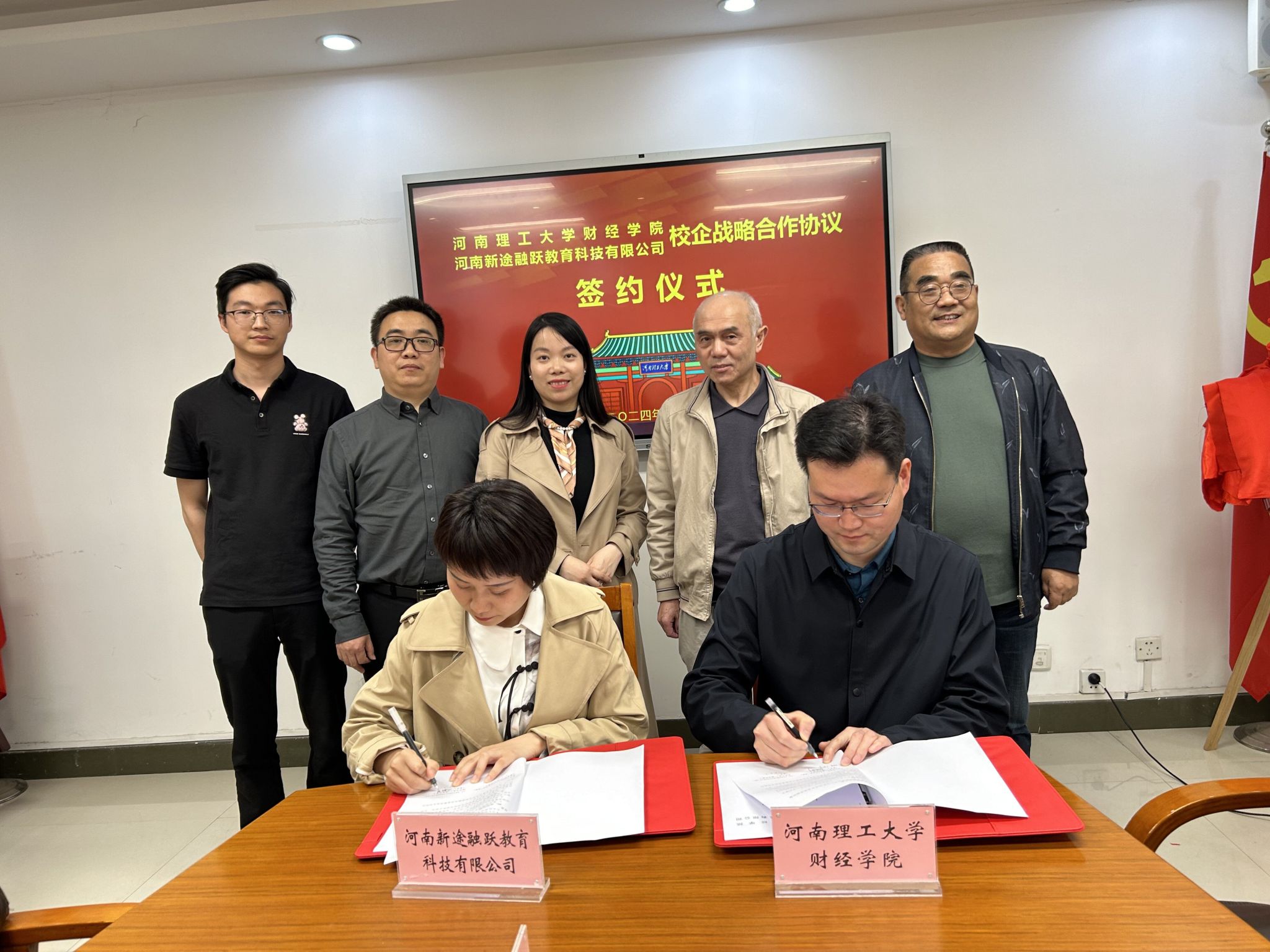为进一步深化产教融合,拓宽学生实习与就业新渠道,拓展校企协同育人新途径,构建高质量人才培养体系,4月9日下午,财经学院与河南新途融跃教育科技有限公司校企战略合作协议签约仪式暨校企合作单位揭牌仪式在经管楼2102会议室举行。学院院长刘霞辉,副院长张圣利,实验中心主任石勇,河南新途融跃教育科技有限公司副总裁杨俊鑫,河南分公司总经理洪颖慧,河南分公司副总经理陈林,校区主管张博、杨阿倩等参加仪式,仪式由副院长张圣利主持。