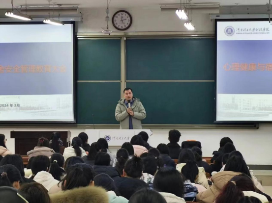 2月27日下午,财经学院在三号教学楼3106教室召开新学期心理健康与宿舍安全管理教育大会。学生干部代表和全体宿舍长共270余人参加会议。学院党委副书记张良出席会议并讲话。会议由辅导员王妍主持。