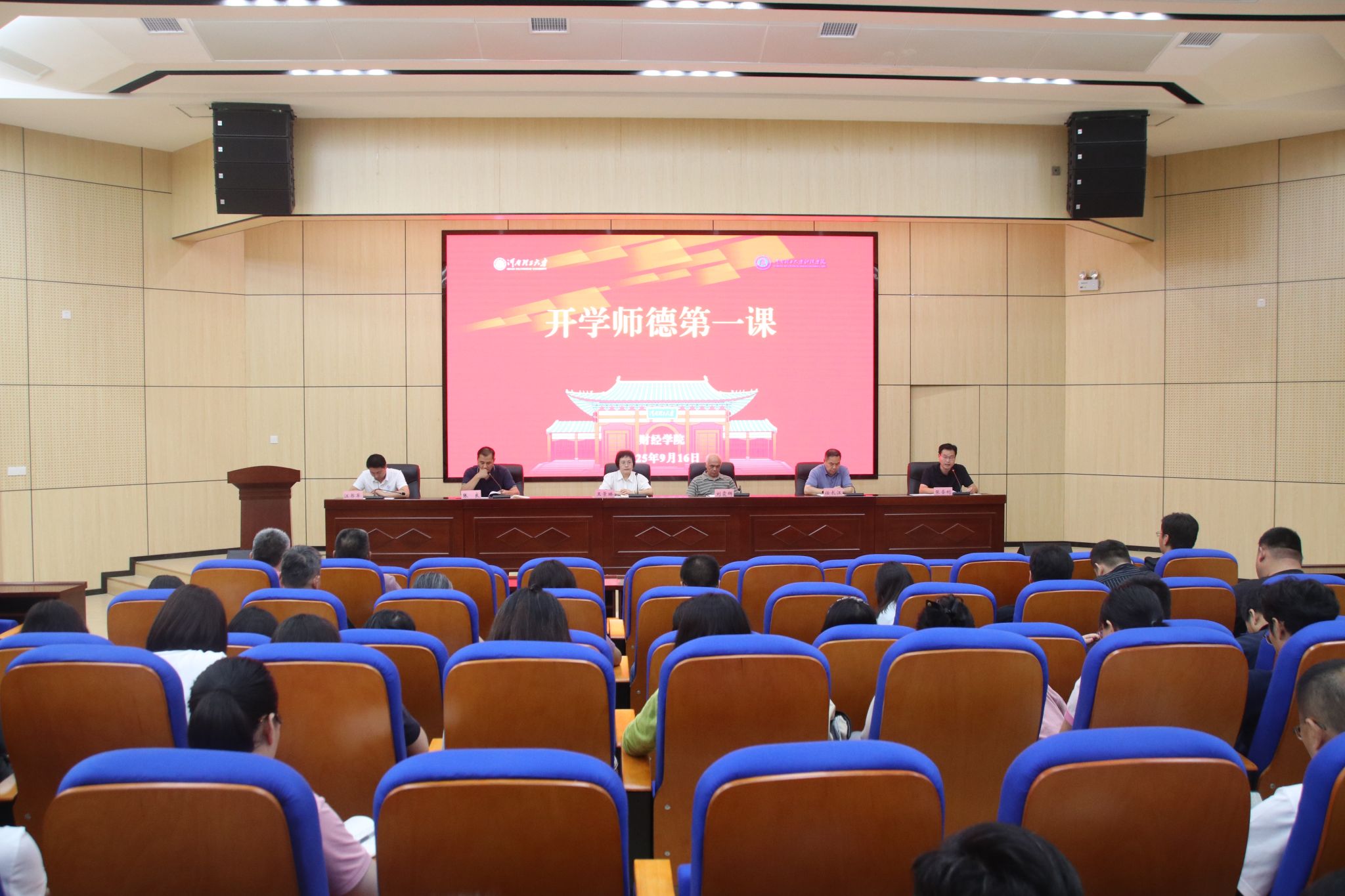 为贯彻落实教育家精神铸魂强师行动,加强师德师风建设,强化红线意识,树牢底线思维,营造风清气正的育人环境,9月16日下午,财经学院在经管楼尚为学术报告厅开展“开学师德第一课”活动。活动由党委副书记张良主持、副院长张圣利主讲,学院全体教师参加活动。