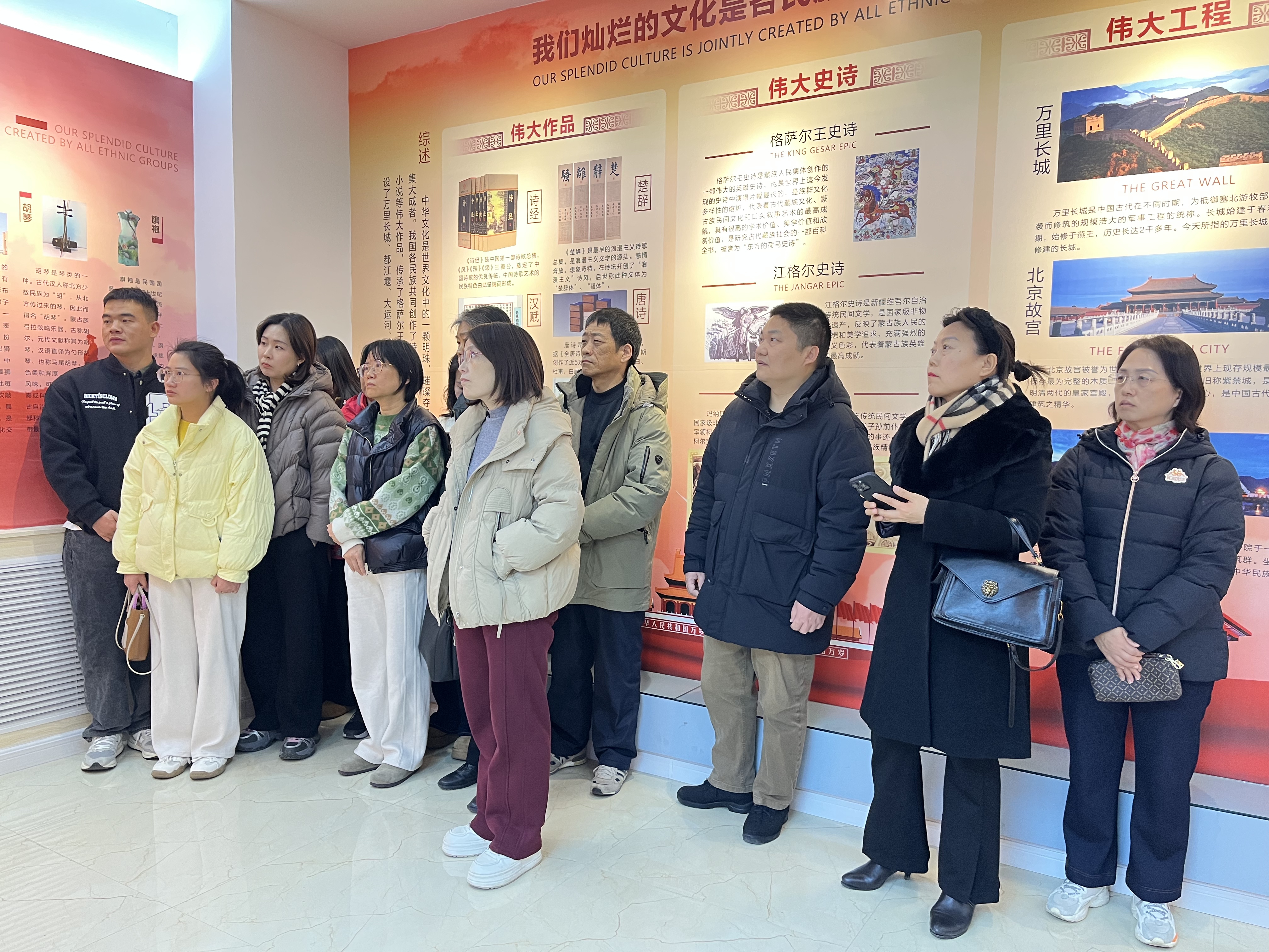 在教育馆内,师生们通过沉浸式体验与互动式学习,进一步深化了对中华民族共同体形成与发展历程的系统认知。师生们通过讲解员的专业引导、翔实的历史事件脉络,系统回顾了中华民族多元一体格局的形成发展历程,深入了解了各民族在历史长河中共同开拓疆域、书写历史、创造文化、培育精神的伟大实践,真切感受了中国共产党领导各族人民团结奋进、共建美好家园的光辉成就。大家认真聆听讲解,不时驻足观看,深刻感悟中华民族深厚的历史底蕴和强大的凝聚力和向心力,深入理解铸牢中华民族共同体意识的重大意义、核心内涵与实践要求。