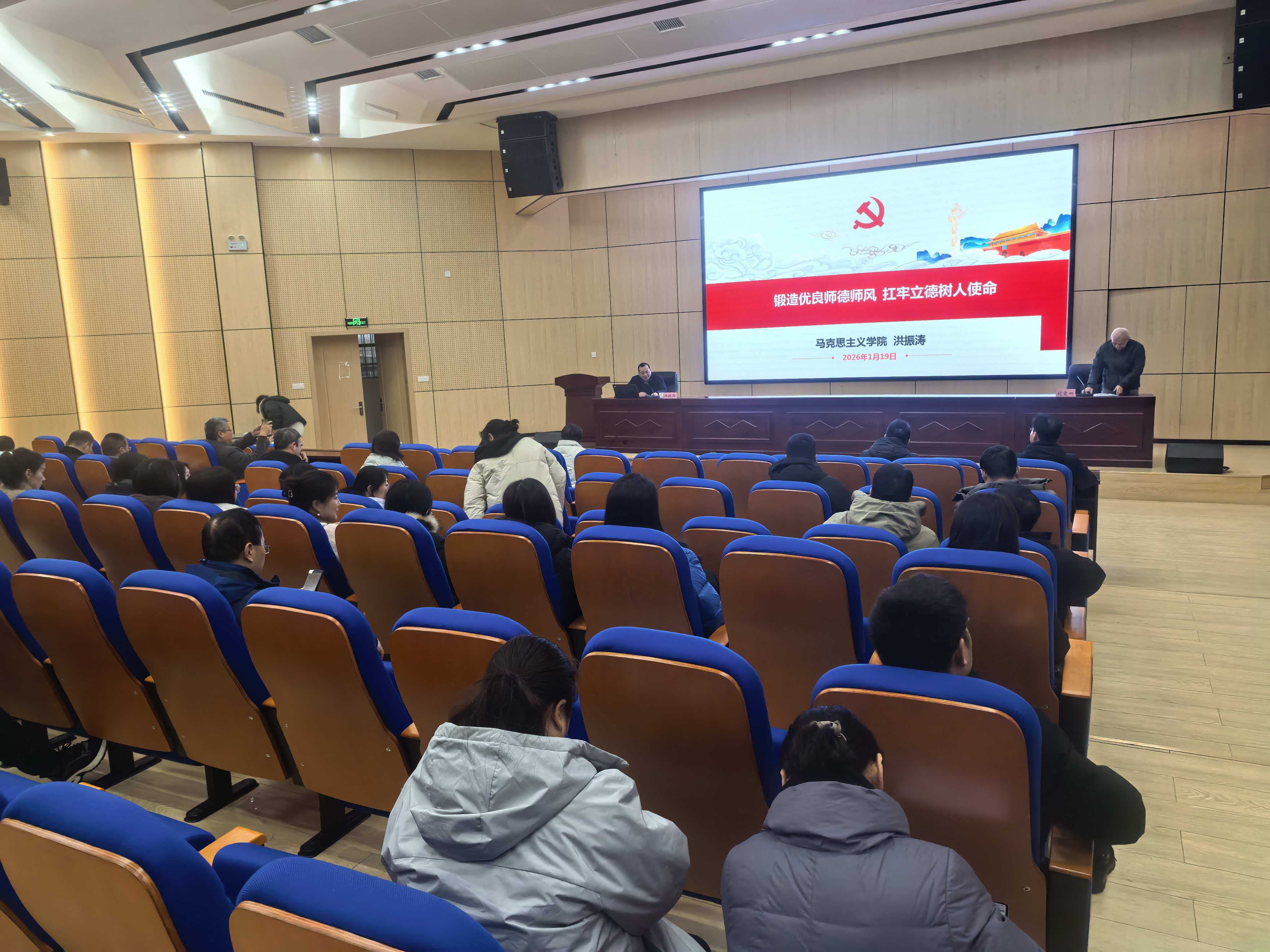 首场报告由马克思主义学院党委书记洪振涛教授带来《锻造优良师德师风 扛牢立德树人使命》。洪教授结合近期教育领域典型案例,深入阐释“师德师风第一标准”的时代内涵,号召教师以“大先生”情怀做学生成长的引路人。