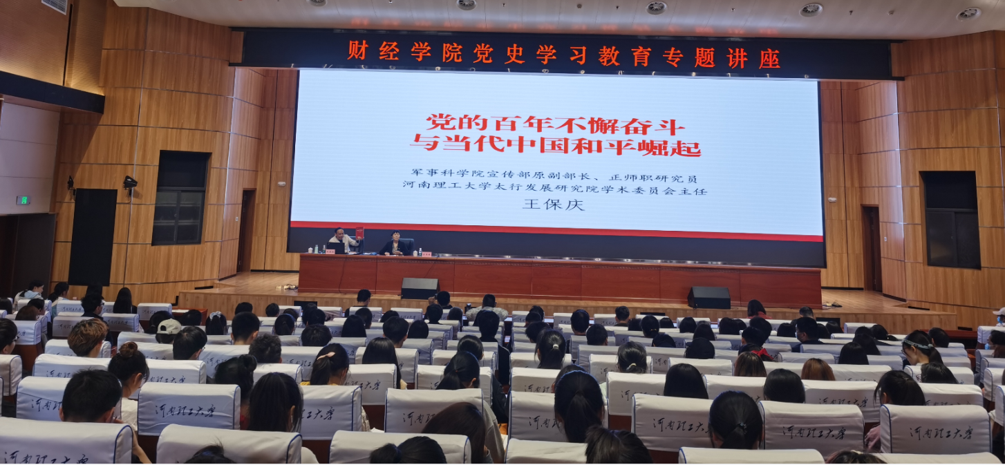 4月28日下午,财经学院特邀军事科学院原战略部研究员王保庆教授在学校新图书馆A报告厅做党史学习教育专题报告会。学院全体教师及部分学生代表共330余人参加了报告会,会议由院长梁丽娟主持。