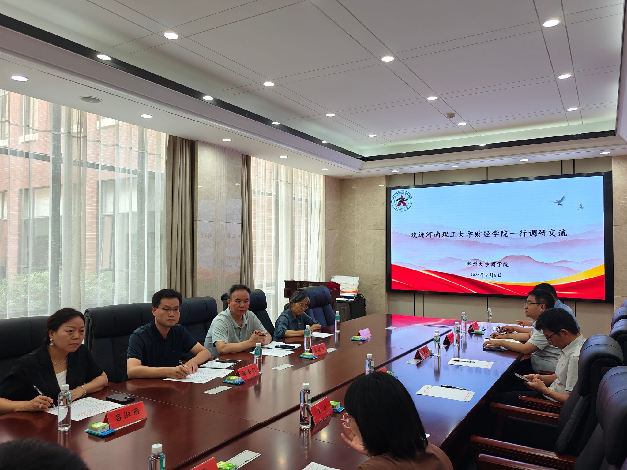 在郑州大学商学院,副院长江求川等热情接待了我院调研组一行。在交流会上,张圣利介绍了我院的发展历程、基本情况和专业特色,着重阐述了当前在专业建设以及在2025版人才培养方案修订中遇到的问题与困惑。江求川详细介绍了郑州大学商学院学科发展、专业设置以及师资队伍建设等情况,重点介绍了金融学专业在拔尖创新人才培养、中外合作办学、分类培养体系、实习基地建设等方面的经验做法。最后,双方就专业建设、课程建设、人才培养、党建工作等具体工作进行了深入的交流。