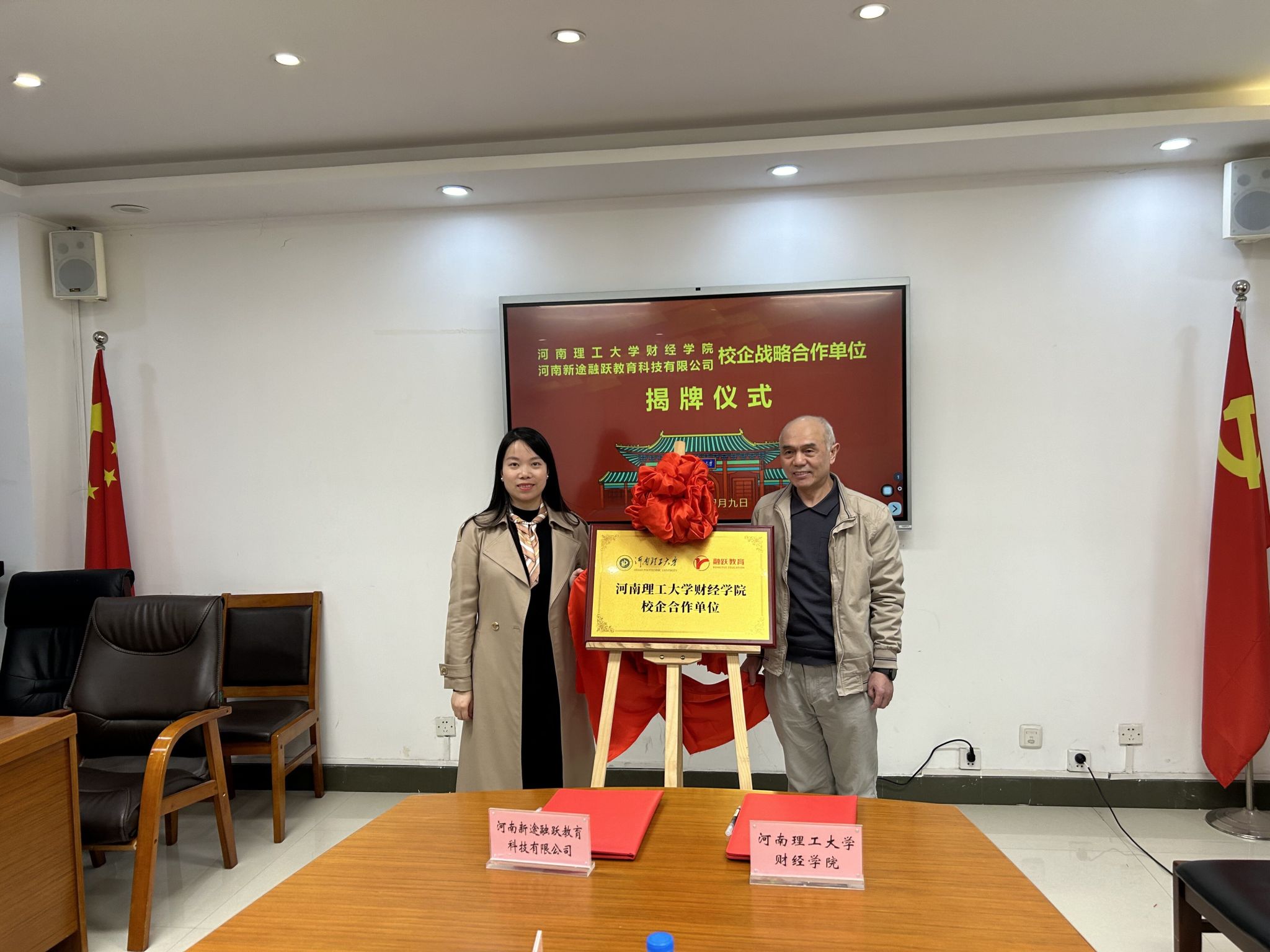 为进一步深化产教融合,拓宽学生实习与就业新渠道,拓展校企协同育人新途径,构建高质量人才培养体系,4月9日下午,财经学院与河南新途融跃教育科技有限公司校企战略合作协议签约仪式暨校企合作单位揭牌仪式在经管楼2102会议室举行。学院院长刘霞辉副院长张圣利实验中心主任石勇,河南新途融跃教育科技有限公司副总裁杨俊鑫河南分公司总经理洪颖慧河南分公司副总经理陈林校区主管张博、杨阿倩等参加仪式,仪式由副院长张圣利主持。