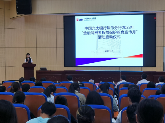 为引导广大学子学会防范金融风险、切实增强广大学生金融安全意识和防范金融风险能力,9月15日,由中国光大银行焦作分行承办的2023年“金融消费者权益保护教育宣传月”启动仪式在河南理工大学财经学院学术报告厅正式启动。院长刘霞辉、国家金融监督管理总局焦作分局副局长张士兵先后致辞,监管部门、光大银行代表与我院金融系代表出席了启动仪式。财经学院金融21级、22级学生参加了此次活动。