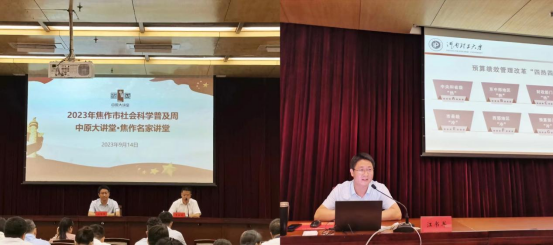 9月14日,焦作市举办了社会科学普及周中原大讲堂·焦作名家讲堂,我院副院长江书军副教授受邀参加,并围绕“全面实施预算绩效管理 助力经济高质量发展”做专题报告。