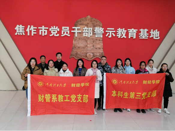 为深入推进党风廉政建设、提高教师队伍廉洁自律意识,筑牢拒腐防变的思想道德底线,切实加强支部党员监督、管理和教育,12月7日,财管系支部前往焦作市委党校反腐倡廉教育基地,开展了“警钟长鸣守初心,清正廉洁担使命”主题党日活动,财务管理系全体教师和财务管理专业部分学生党员代表,参加了此次活动。