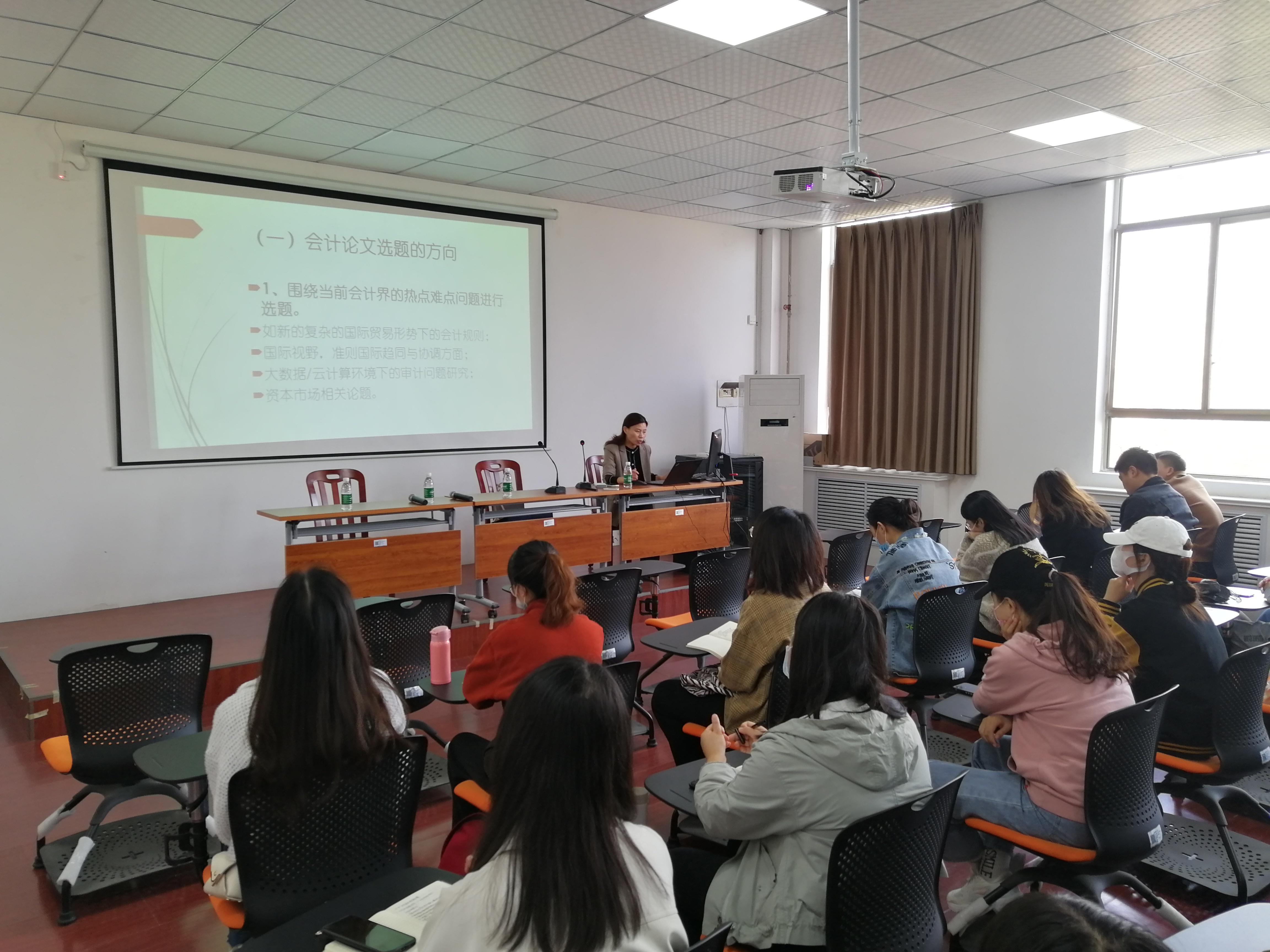 会议伊始,张老师对熊年春副主编的履历进行了介绍,并对她的到来表示热烈欢迎和感谢。随后,熊主编作了题为《会计论文选题与写作------以会计学科为例》的学术报告,该报告以会计论文选题、选题需要关注的问题、部分会计论文选题列举三大部分展开。其中,针对会计论文选题熊主编给出了三点建议:一是围绕会计届当前研究的热点、难点问题进行选题;二是针对自己感兴趣的领域,就一些现象、问题进行选题;三是围绕会计工作实践选题。同时,提出了选题需要注意的五个方面:忌脱离个人业务专长、忌选题过大或是过窄、忌选题不看文献资料、忌脱离现行法律法规框架、要重视数据或案例资料的取得。最后,列举了实证研究、案例研究、调查类研究的框架结构与写作要领。