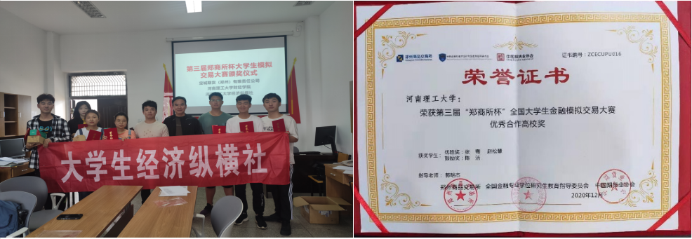 5月17日下午,财经学院举办了第三届“郑商所杯”大学生模拟交易大赛颁奖典礼。我校有100多名学生参加了此次大赛,其中金融学专业张骞、赵松慧同学获得总决赛优胜奖,陈洁同学获得鼓励奖,河南理工大学再次荣获“优秀合作高校奖”,宝城期货有限责任公司荣获“优秀会员组织奖”。经宝城期货郑州营业部与我院联合评选,对我校9名校级优秀参赛者进行了表彰奖励。
