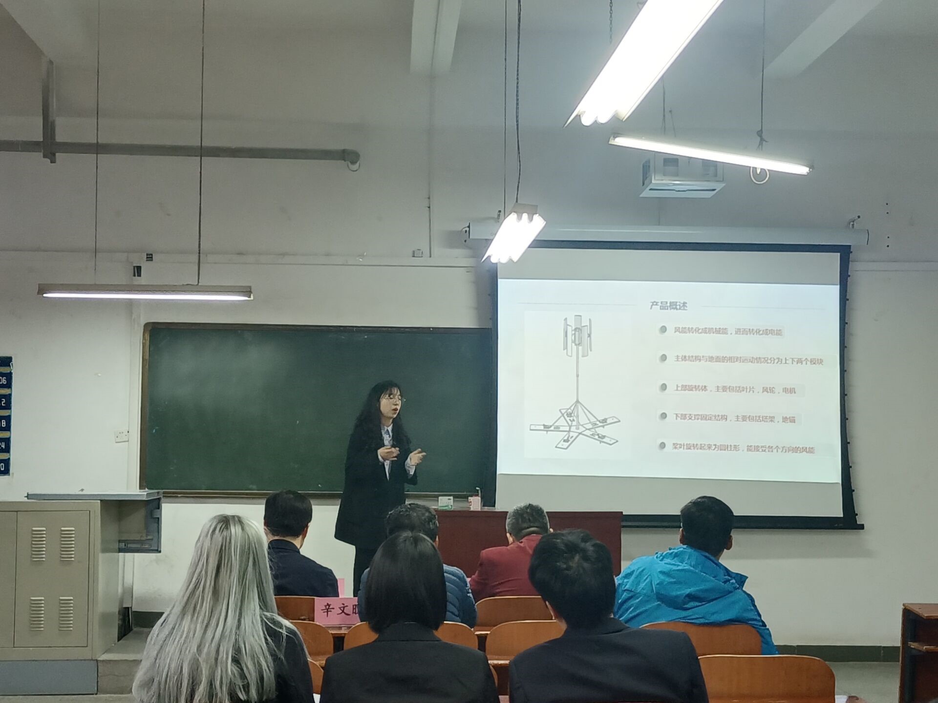 主持人上台致开场词宣布比赛正式开始并简要介绍了评委老师、比赛内容以及比赛规则。比赛过程中,十组队伍按抽签顺序依次上台根据各组制作的PPT进行答辩。每组成员上台对其队伍设计的节能产品的设计理念、设计原理及用途进行了详尽地阐述。赵如意组回收矿井中低温热能的创意不仅减少了能源的浪费,更能解决热泵机表面结霜的恶性循环;吴浩菱小组提出的废弃纸质文件的处理方式系统全面,不仅绿色高效地处理了废弃纸张,更预防了商业机密的泄露;何梦悦队伍的矿山溜煤眼落煤势能发电装置高效地利用了矿山资源的同时减少了经济损失和环境污染;朱莉雅小组对大众对纸吸管使用情况的反馈调查贴近生活,关注消费者意见,科学分析调研数据以便更好的进行纸吸管的普及进而减少对塑料制品的依赖,实现绿色节能的目的;黄江歌队伍关于治理灯光污染的措施致力于减少和防范光污染,但也被评委老师指出其不足之处在于调查样本数量和角度有限,数据的分析仍有进步的空间。经过激烈的角逐,这五位选手所带的队伍在十组选手中表现优异脱颖而出,获得进入校赛的资格。