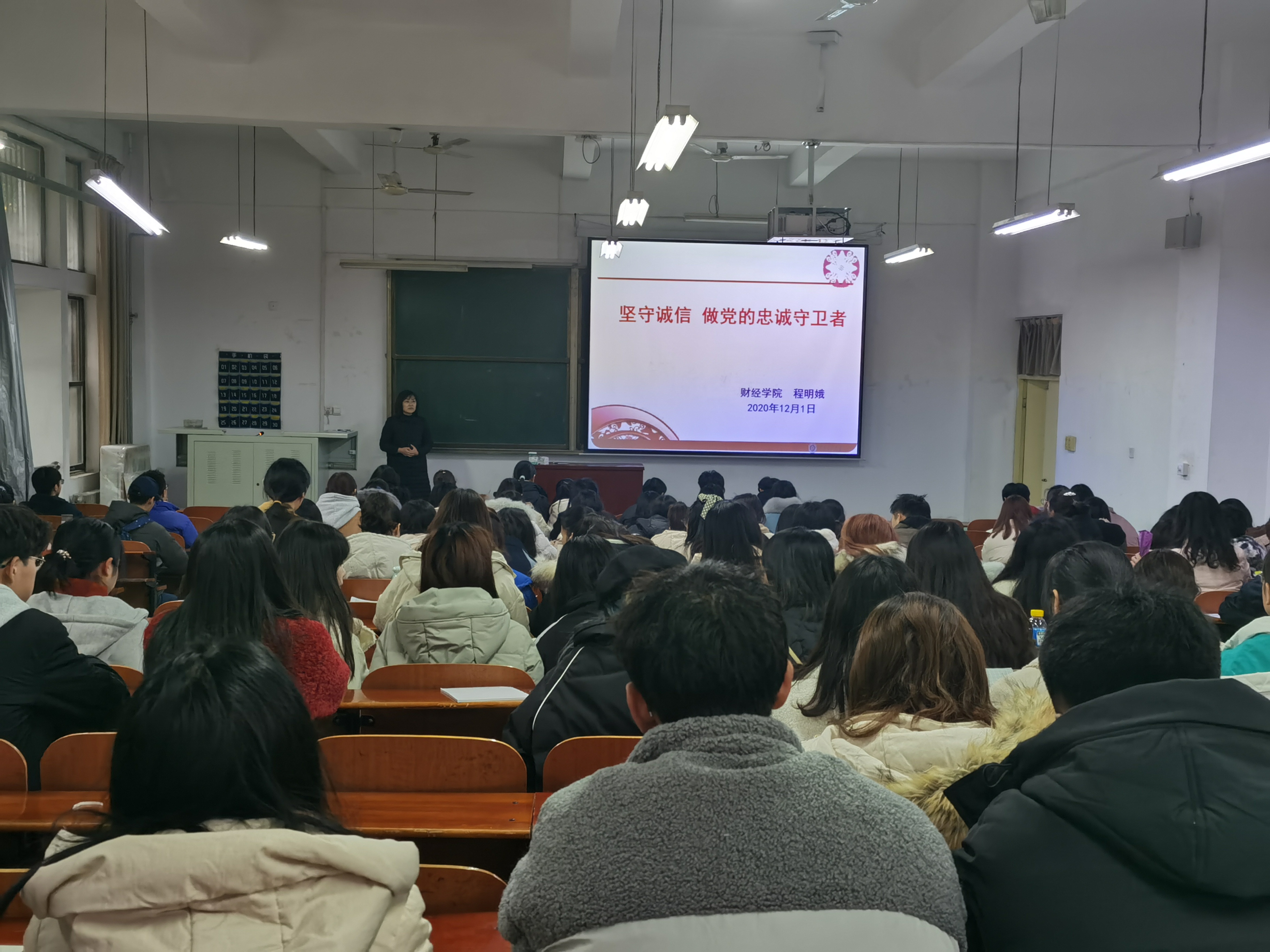 12月1日,财经学院副院长程明娥在经管楼1112教室为全体党员上《坚守诚信、做党的忠诚守卫者》的专题党课。