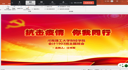抗击疫情,你我同行。5月29日,会计专业1903班在线上组织开展了“抗击疫情,你我同行”的主题班会。此次班会在钉钉班级群中开展,由班主任组织带领同学们进行线上视频会议。