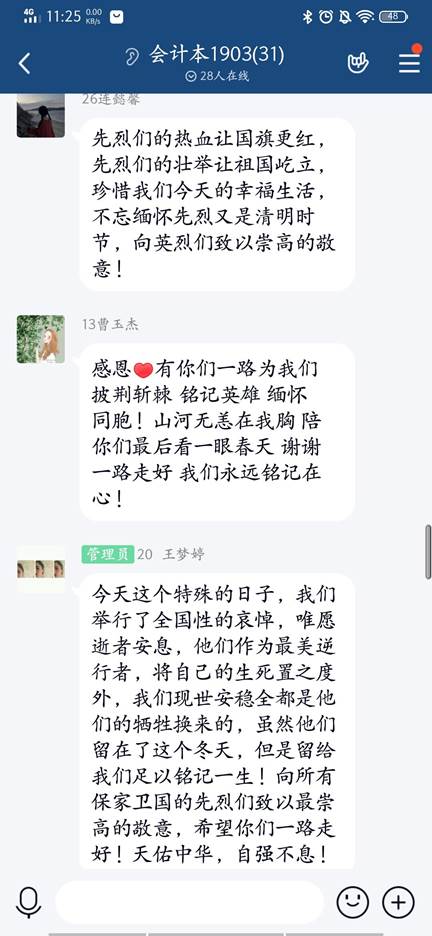 会计1904班团支部组织全班同学在4月4日10:00进行就地就便形式的三分钟哀悼活动,接着便进入了网上祭奠活动,通过网上祭拜、鲜花、留言和浏览革命先烈的英雄事迹,同学们对于先烈的英勇无畏,对于他们的舍小家为大家的种种令人敬仰的品质和行为感慨万千,纷纷在QQ群里发表了各自的感想,这是一种共情,这更是属于国人应有的自豪感,我们应该为此骄傲。