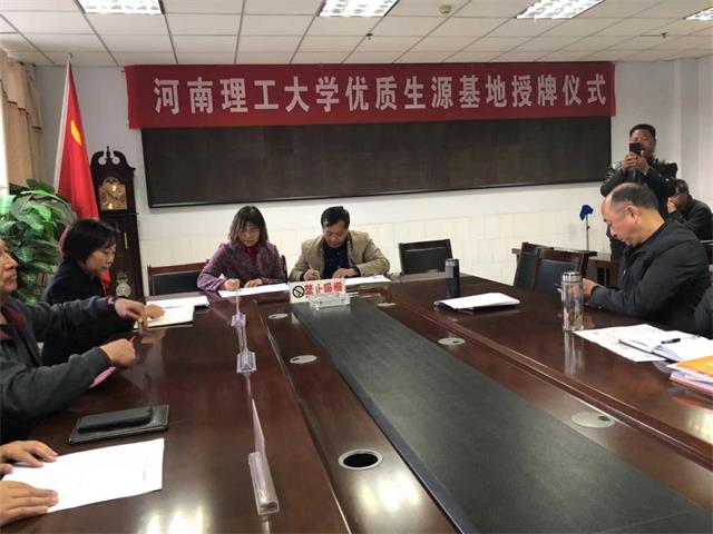活动在武陟县第一中学报告厅举行。武陟县教育局局长孙小明、武陟一中校长马东升、武陟河朔中学校长荆福利以及两所中学的师生代表。武陟县教育局局长孙小明在致辞时,感谢河南理工大学对武陟教育的认可与肯定。本次授牌仪式,是对武陟一中和河朔中学的肯定,也是对武陟基础教育的认可。随后程明娥向与会领导和师生介绍了我校的办学历史、专业设置及近年来两所中学向我校输送的优质生源等情况。随后,双方代表签订了优质生源基地建设协议并举行了授牌仪式。