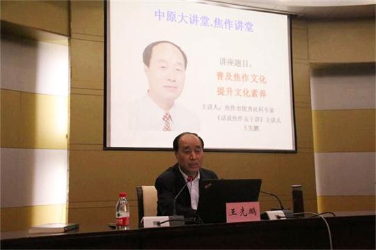 报告会上,王先鹏从如何领悟焦作文化、焦作人应知道的文化和对焦作文化的几点思考等三个方面讲述了焦作地名的由来、焦作历史文化概况、焦作历史名人、焦作特色文化,分享了他个人对焦作文化的感受与思考。报告中,他通过三次难忘的亲身经历,畅谈了对焦作古今历史文化的真实感受,提出“焦作山水属于大山大水大风光”、“焦作山水文化、名人故事,可谓丰富多彩,数不胜数”、“平原大多村庄历史短暂,沿山村庄多数历史久远”、“焦作各类文化源远流长”,以及“焦作文化丰富多彩、独具特色,但厚而不重”等观点,引起师生共鸣。他还分析了焦作独特的历史渊源,地理位置、地理地貌,介绍了焦作历史上的故国名城和十大特色文化。最后,王先鹏结合焦作市经济社会发展现状,提出了将怀川文化全面转化为焦作旅游文化,提升焦作城市文化品位;将怀川经典文化转化为焦作城市地标性建筑及地标性文化符号;挖掘焦作养生、饮食文化,打造焦作养生、特色饮食品牌等引人思考的现实问题,思想新颖而独特,见解深刻而全面。