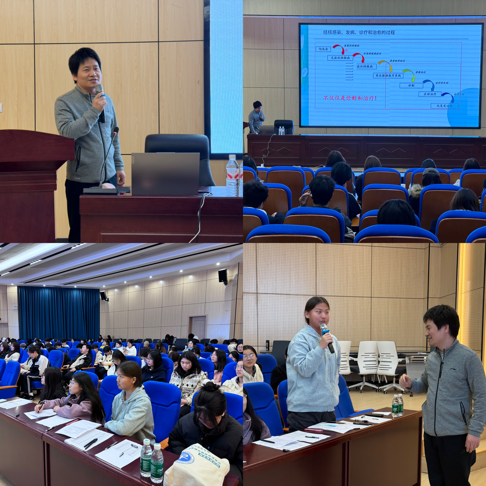 本次讲座余波老师以目录页开篇,围绕结核病基础与校园风险、校园结核疫情案例、结核诊疗及筛查和防控流程措施四大板块展开。余波老师结合专业医学知识与校园场景,深入浅出地讲解了结核病的致病原理、传播途径,分析校园人员密集环境下结核病的潜在风险,并通过真实疫情案例警示师生重视防控细节。在结核诊疗及筛查环节,余波老师详细介绍了结核病的早期症状、科学诊断方法及筛查流程,引导师生正确认识“早发现、早诊断、早治疗”的重要性,现场还针对校园内如何做好个人防护、密切接触者如何筛查等师生关心的问题进行了互动答疑。在讲座过程中,师生们认真聆听、记录要点,不少人拿出手机拍摄课件或录下讲解内容以便后续复习,参与讲座的学生表示:“以前对结核病的认识比较模糊,以为离校园生活很远,现在才知道校园里也有防控风险,以后会更注意通风、锻炼,也会提醒身边同学关注健康。”